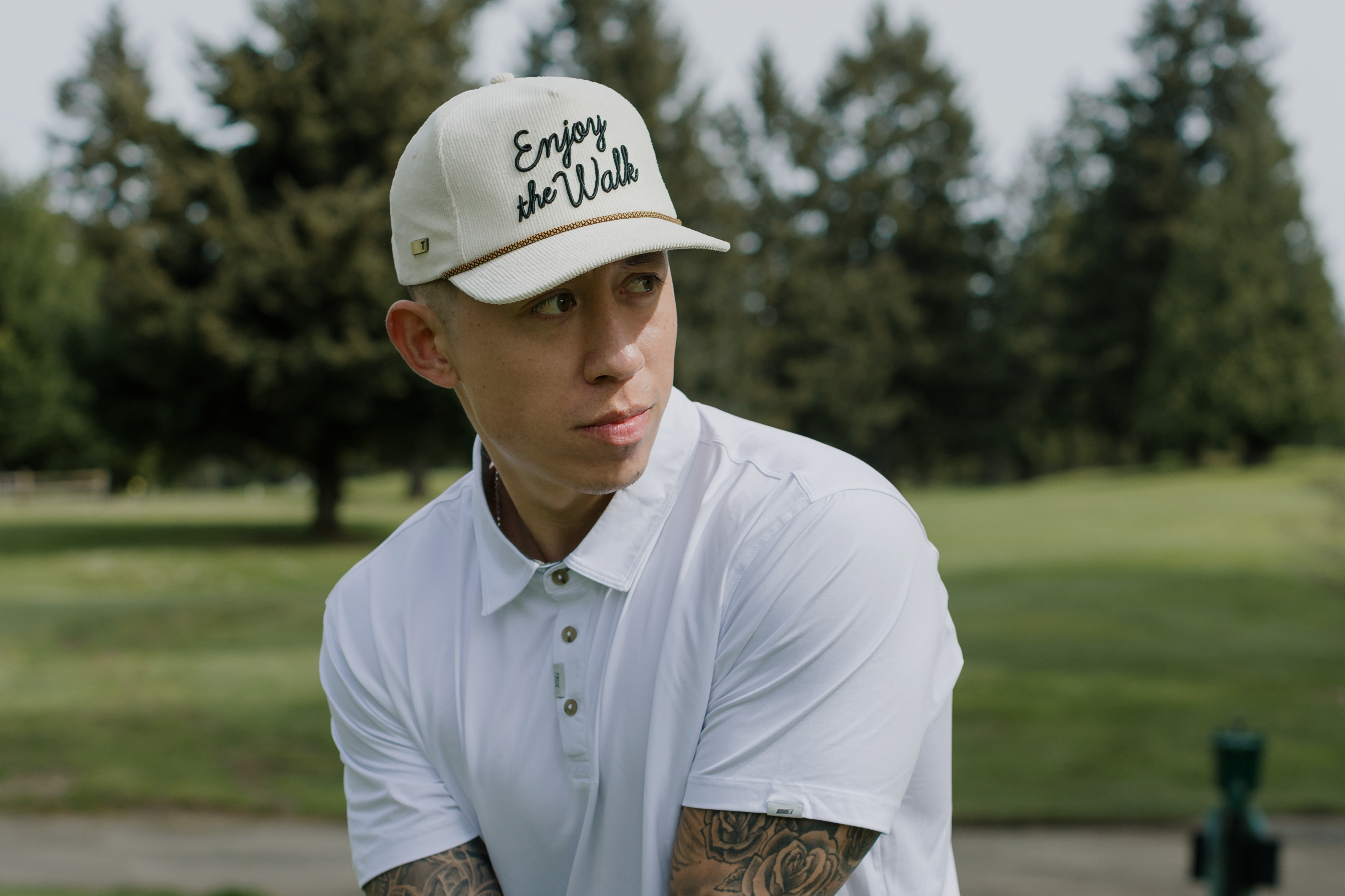Introducing the TRUE 5-Panel Corduroy Strapback featuring our signature “Enjoy the Walk” script. This hat has a classic corduroy vibe with a modern twist, perfect for anywhere - on the course, at the beach, or out for a night. Crafted for ultimate comfort and style, it features a structured front, straight brim, and adjustable leather backstrap with stylish brass accents. Your new go-to for looking sharp and feeling good, wherever you are.